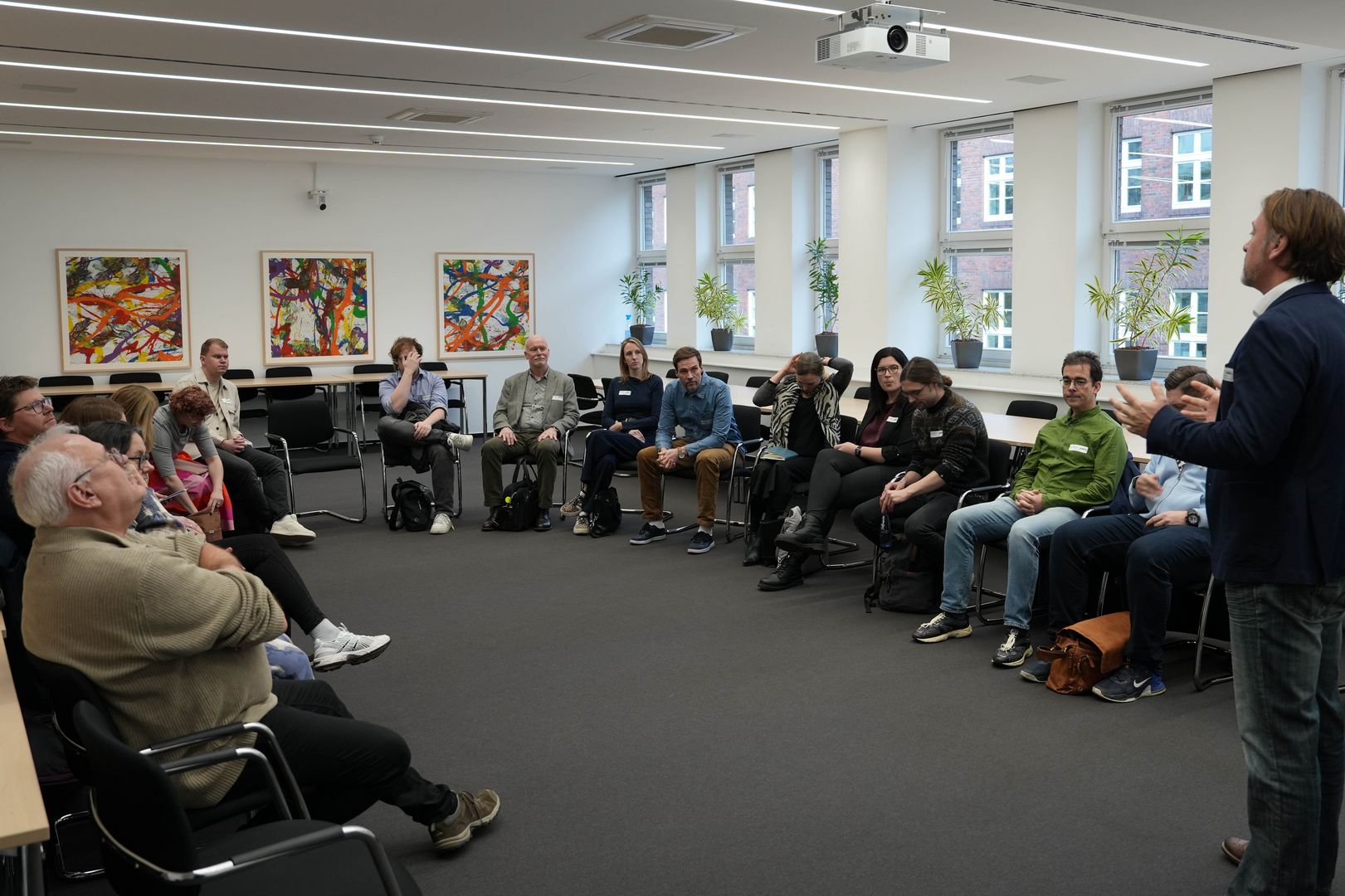 Im Mittelpunkt der Veranstaltung stand ein praxisorientierter Einstieg in die kommunale Förderlandschaft. Nach einem Impulsvortrag zur nachhaltigen Transformation von Kommunen erhielten die Teilnehmenden einen kompakten Überblick über Förderstrukturen, Förderlogiken und den Fördermittelkreislauf. In interaktiven Arbeitsphasen wurden anschließend konkrete Bedarfe aus der kommunalen Praxis identifiziert. Hierbei zeigte sich auch, dass weit über 40 Prozent der Teilnehmenden keine oder nur geringe Erfahrung mit Förderung haben.