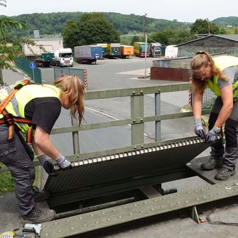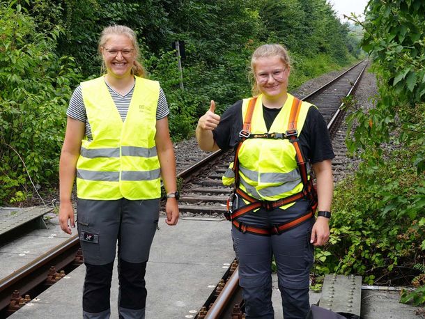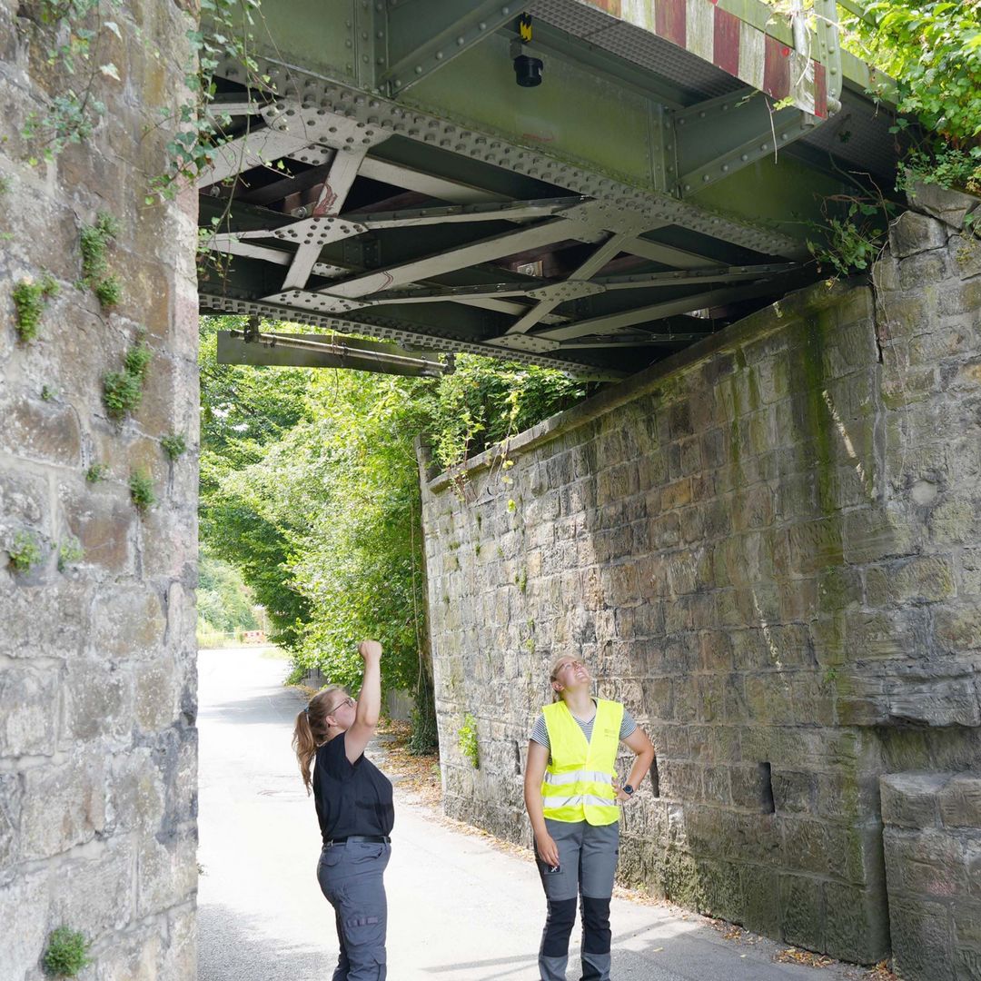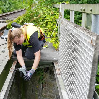Ausgerüstet mit einem Auffanggurt und einer Signalweste steht Anika Hotzel zusammen mit ihrer Kollegin Tomke Prünte auf einer Eisenbahnbrücke in vier Metern Höhe über der Straße. Die beiden Wissenschaftlerinnen haben gerade einen weiteren Hochwassersensor für ihr Forschungsprojekt angebracht und in das Netzwerk eingebunden. Aus Sicherheitsgründen wurde die Eisenbahnstrecke während der Montagearbeiten gesperrt.