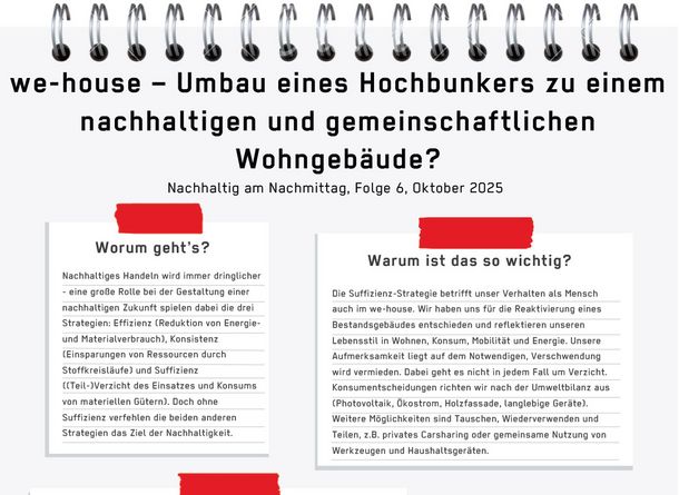 - 7. Oktober 2025 (15.00 bis 16:00 Uhr): „we house – Umbau eines Hochbunkers zu einem nachhaltigen und gemeinschaftlichen Wohngebäude“